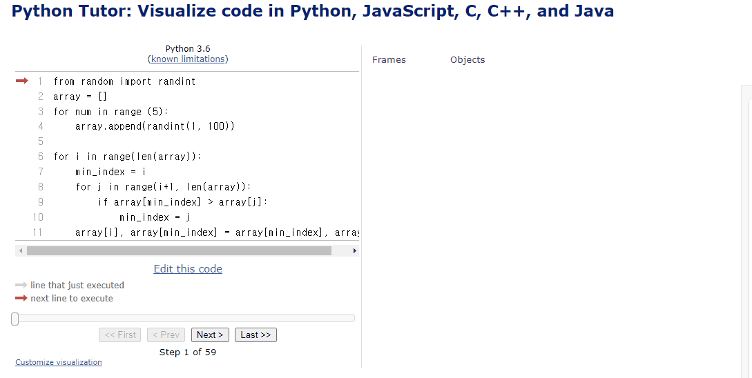 파이썬 튜터는 단계별로 소스를 실행할 수 있는 온라인 IDE 입니다.